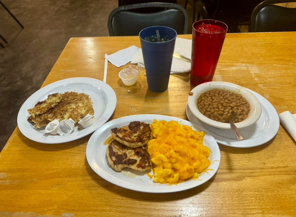 Exit 62 Truck Stop Restaurant is a simple place with homemade cooking. I much prefer any diner to a fast-food franchise. I asked the waitress about the grilled chicken entree on the menu. “It’s good” she replied. How could I refuse after such an overwhelming endorsement? It was basic but good. I choose the mac-&-cheese, baked beans as sides and it included corn bread.