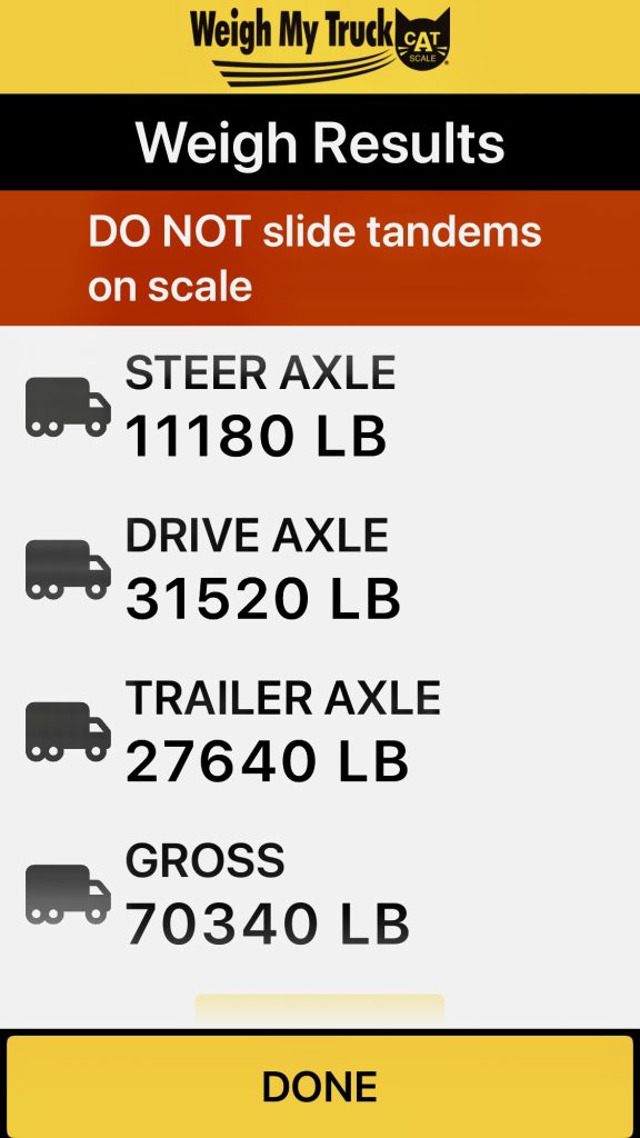I love this route. Both the shipper and consignee are easy to reach off major highways. Both are drop-and-hook and manned 24/7. This time around there was a delay at the shipper. I was ready to go early as my last assignment ended around 15:00 and fortunately there was a truck stop about 10 miles down the road. The load wasn’t ready until noon. I hooked up the trailer and realized that the gear to move the tandem was dislodged and I could not fix it on my own. Taking it to a repair shop would mean hours of delays. The load weighed in at 70,340lbs and both axles were within the DOT Legal limit so I could technically travel with the tandem all the way back. Two issues though, that means that the truck is at its full size so more difficult to maneuver, but it was almost all highway so not a problem. The biggest issue is that certain states restrict the maximum size of a truck according to the placement of the tandems. California is the strictest, but Tennessee also abides by it and I was traveling through there. I would take my chances.